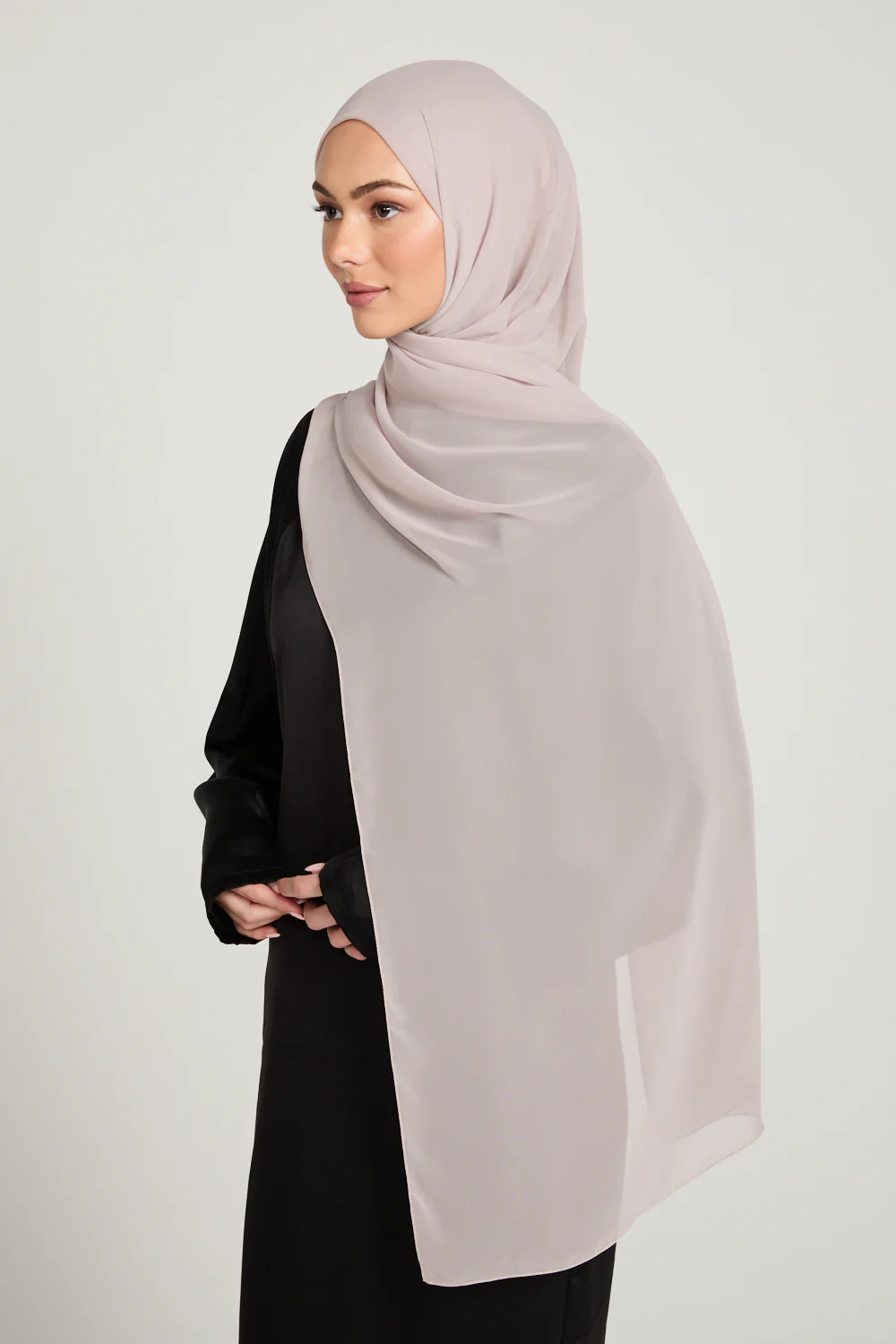 Introducing the Luxury Georgette Hijab in Blush Taupe - a graceful blend of muted elegance and modern charm. Crafted from airy, lightweight georgette, this hijab offers a fluid drape that falls beautifully, creating an effortlessly polished silhouette with every wear.