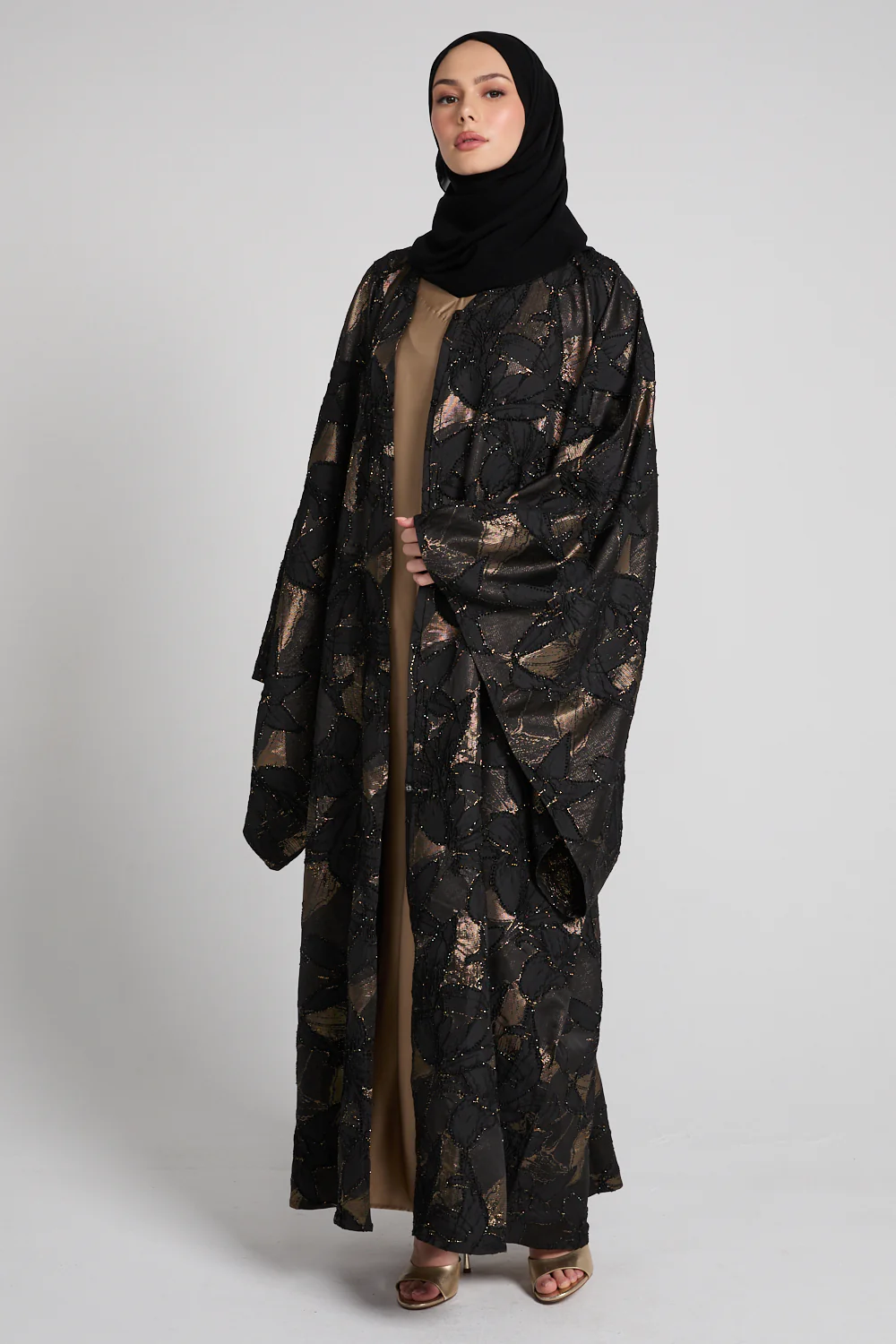 The Luxury Golden Eclipse Embellished Open Abaya – Limited Edition embodies the essence of celestial elegance and timeless allure. Designed in a rich jacquard fabric, it features an intricate gold-thread floral weave with subtle black-on-black embellishment, creating a mesmerizing play of shadow and light just like a golden eclipse.