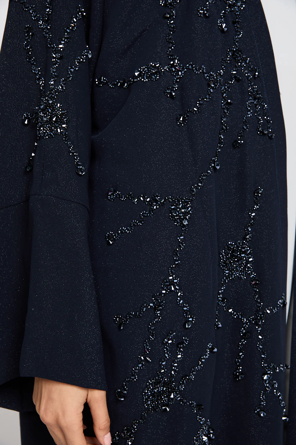 Elevate your eveningwear with the Luxury Royale Dusk Embellished Open Abaya in deep, refined navy. This statement piece is crafted from a textured fabric woven with a delicate shimmer, creating a soft, luminous finish that subtly catches the light with every movement.