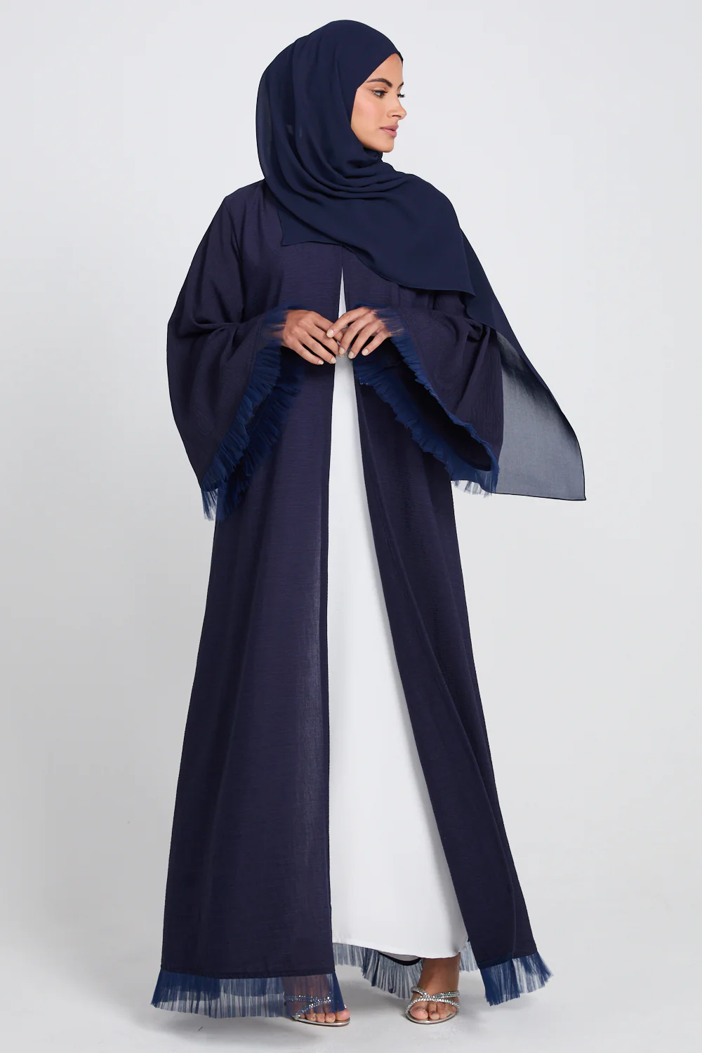 Luxury Textured Open Abaya with Tulle Lace Detailing - Navy