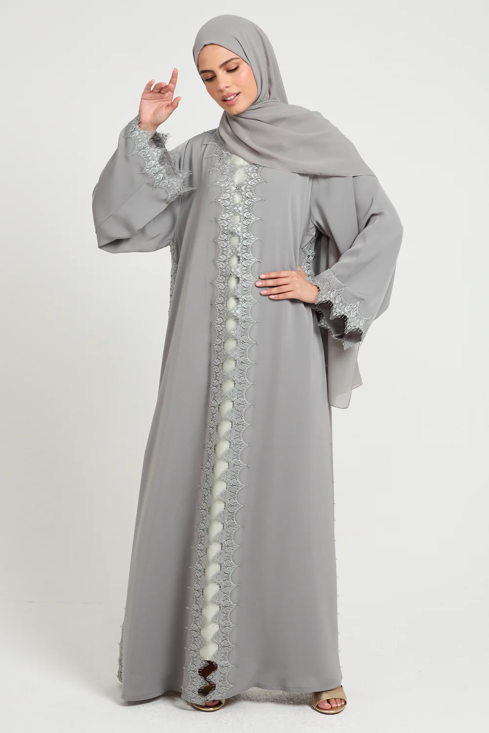The muted olive-grey hue echoes desert stone at dusk: rare, refined, and universally flattering. Whether worn for Eid nights, intimate soirées, or moonlit gatherings, Olive Dove offers presence without effort, elegance without extravagance.