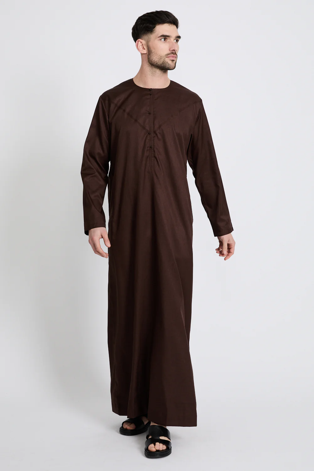 The Premium Emirati Thobe – Rich Auburn exudes sophistication through its minimalist design and exquisite craftsmanship. This thobe features a smooth, soft texture that guarantees ultimate comfort and a polished look. The Rich Auburn colour brings a deep, warm reddish-brown tone, offering a timeless appeal that is perfect for both formal and casual settings.