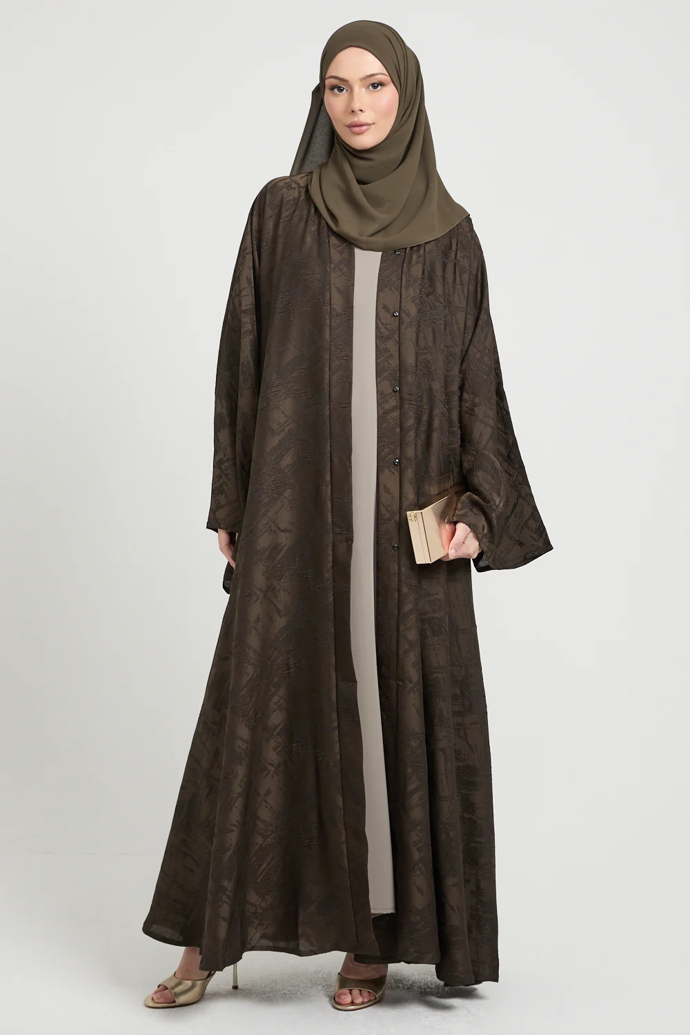 Crafted from a luxe jacquard fabric, the fabric carries a tonal, abstract textured motif that gives the abaya visual depth without overpowering its elegance. The muted deep olive-brown undertone evokes woodland dusk, complemented by the subtle sheen of woven detailing that catches light in the most refined way.