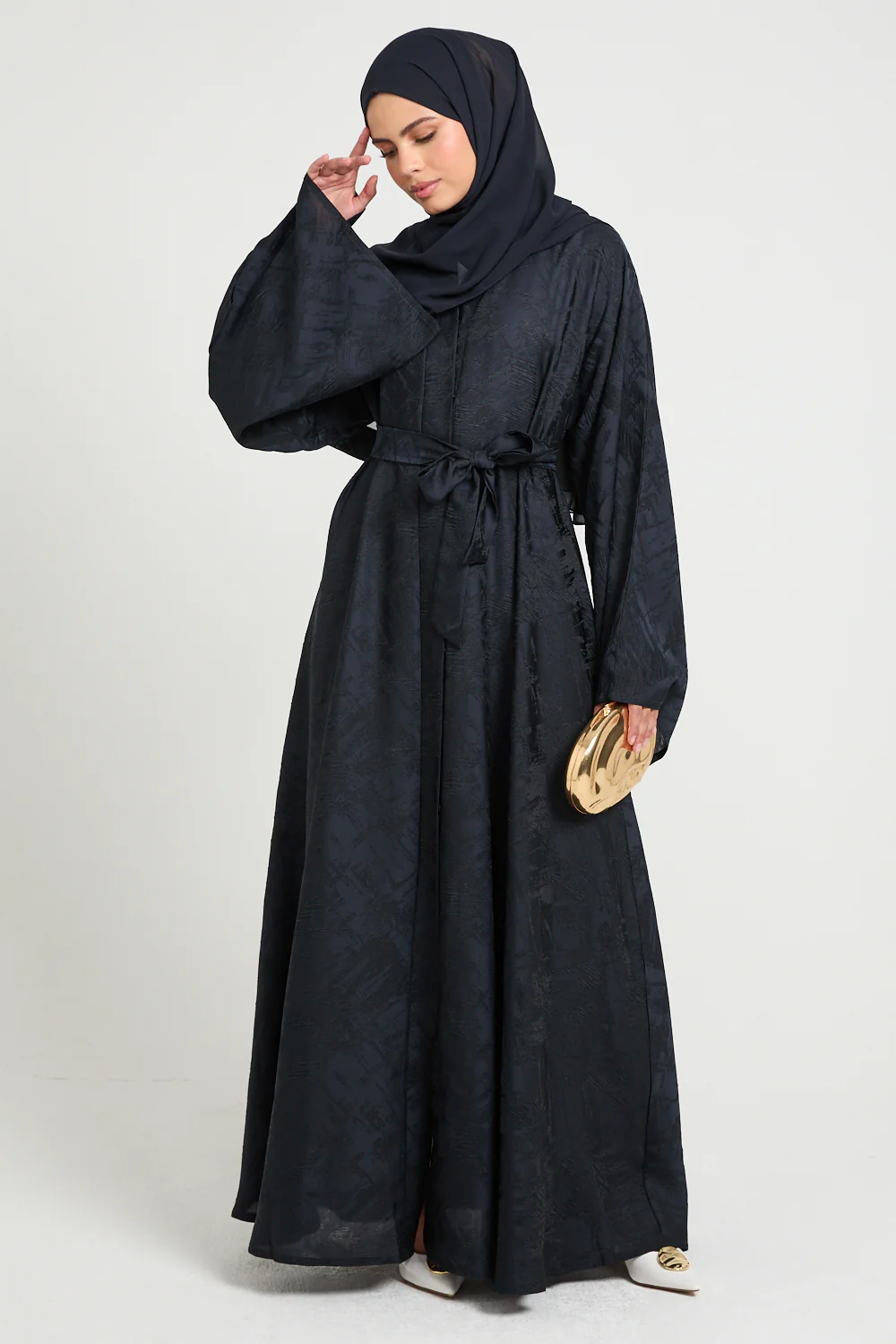 Crafted from premium jacquard, the fabric reveals a tonal, textured abstract weave that gives the abaya striking visual depth without overwhelming its serenity. The rich midnight navy tone feels like moonlit indigo - quiet, powerful, and infinitely sophisticated. Its woven detailing catching light only in hints, never in excess.