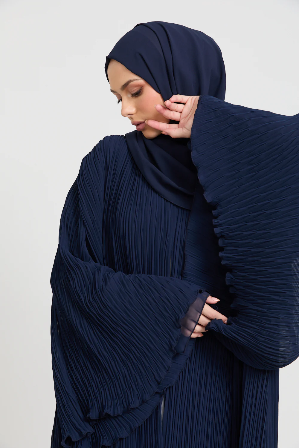 Premium Pleated Open Abaya with Flared Sleeves - Navy