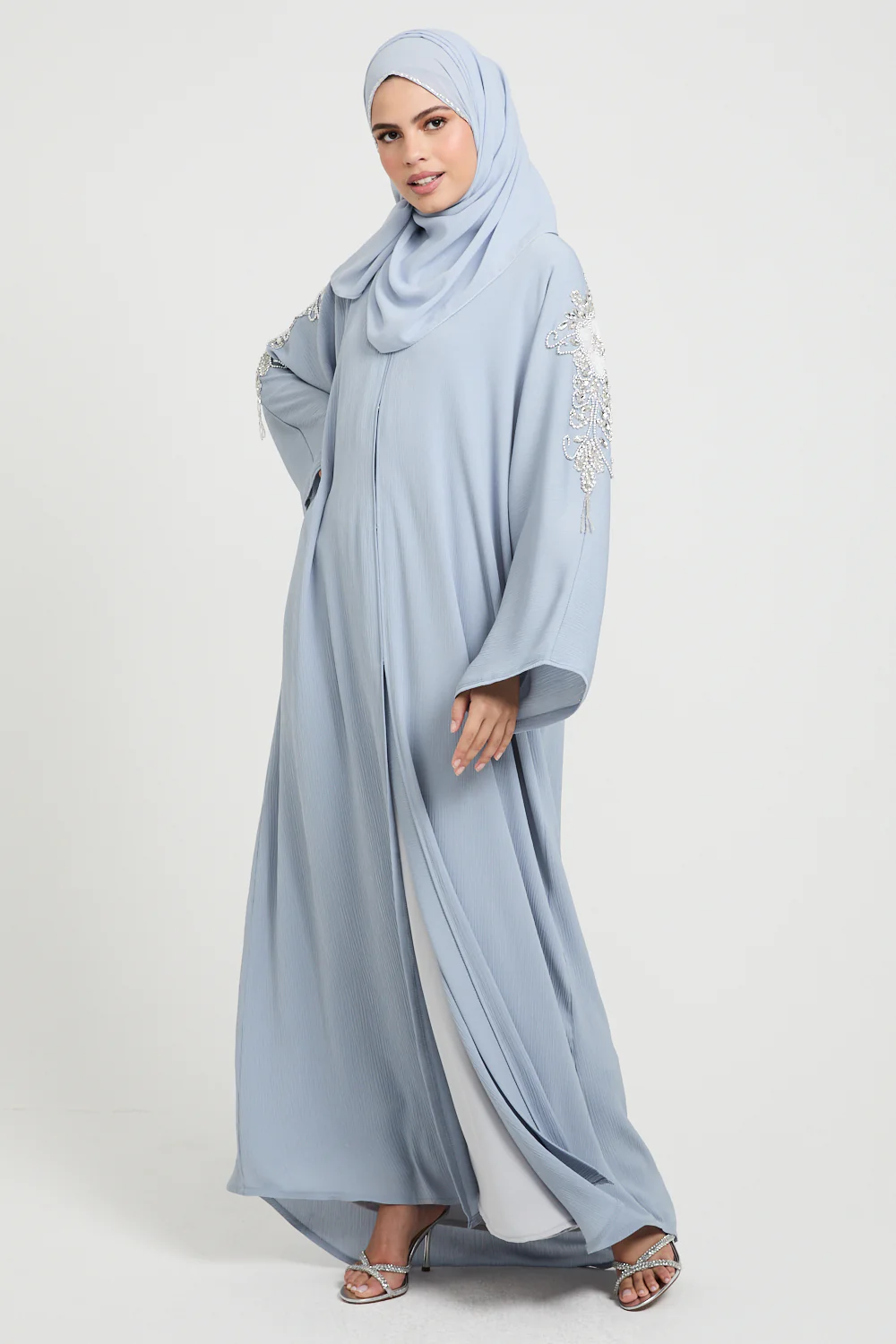 Premium Textured Frosted Bloom Luxe Open Abaya - Dusky Powder Blue