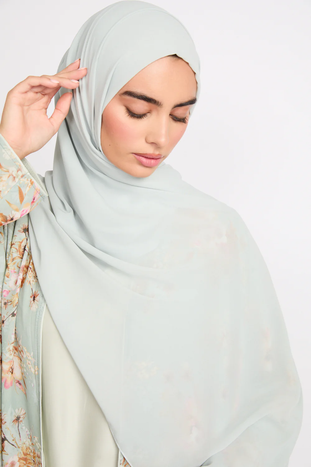 Immerse yourself in the serene elegance of nature with the Frosted Mint georgette hijab. Crafted from the finest soft luxury georgette, this hijab offers a beautifully smooth drape and lightweight comfort, perfect for all-day wear. The soft minty hue of Frosted Mint evokes the refreshing calm of a misty morning, with an understated elegance that complements any outfit effortlessly.
