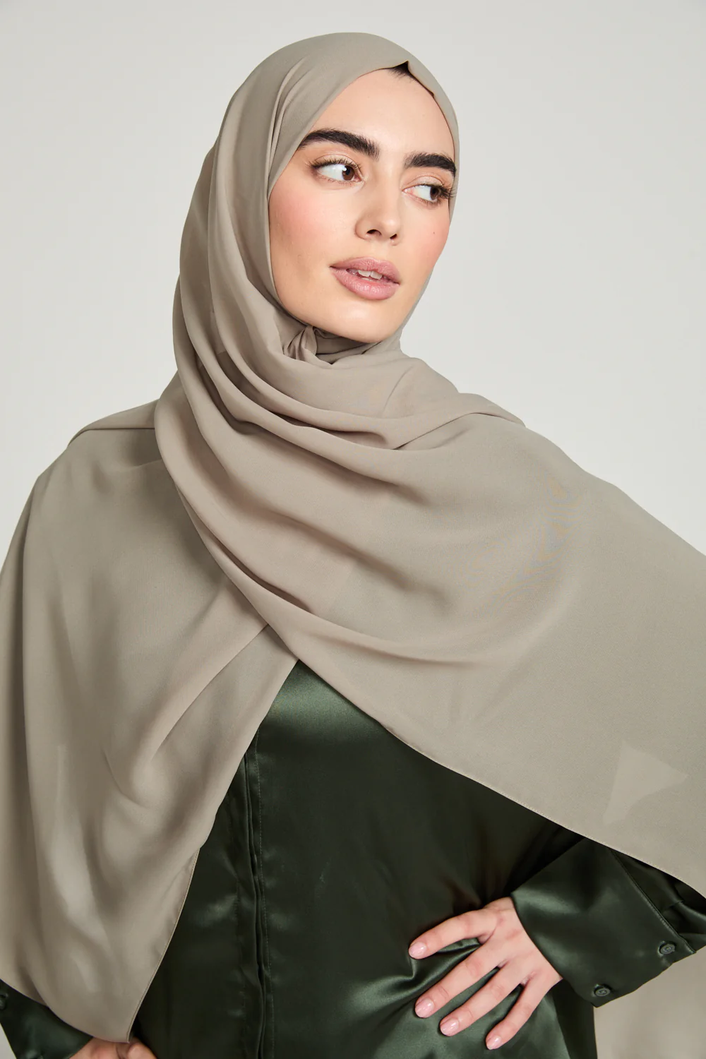Embrace elegance and sophistication with the Olive Whisper georgette hijab, crafted from the finest soft luxury georgette fabric. This timeless piece offers an effortlessly smooth drape, with just the right amount of fluidity for a chic and graceful look. The Olive Whisper hue is a delicate blend of earthy olive tones, with a soft, muted undertone that whispers of natural beauty and tranquillity.