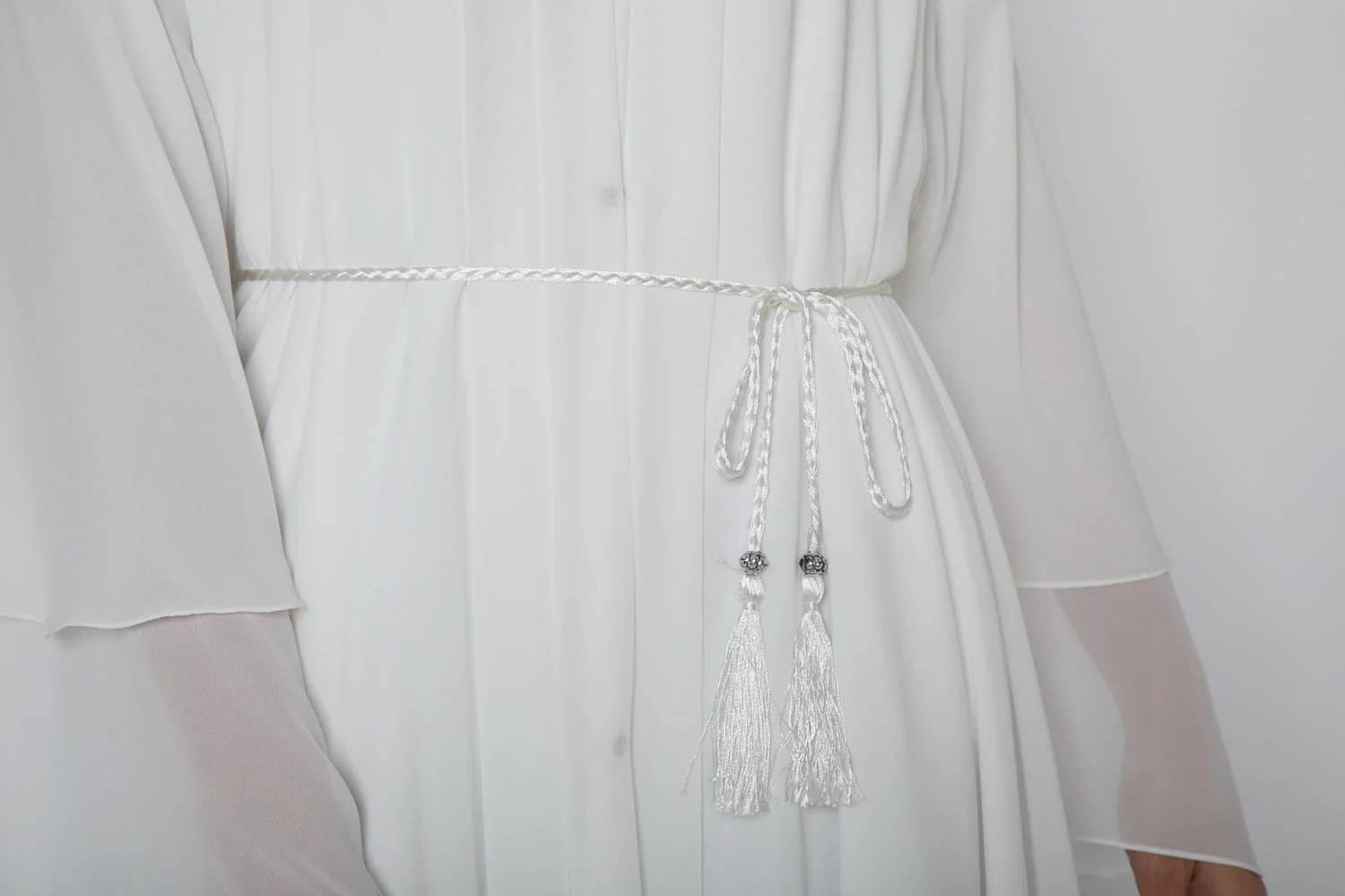 White Slim Plaited Rope Tassel Belt